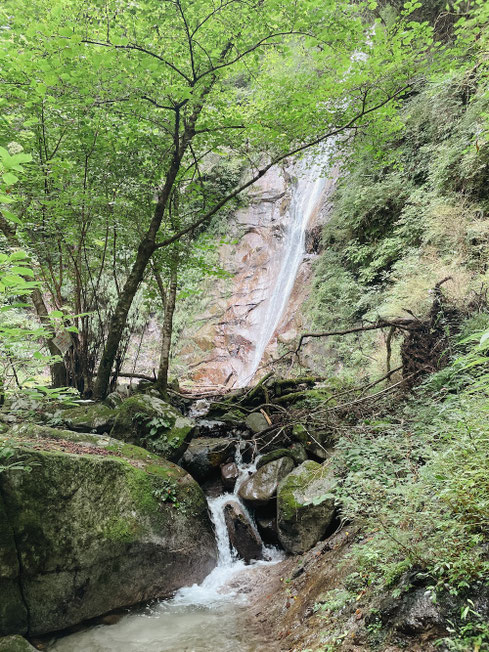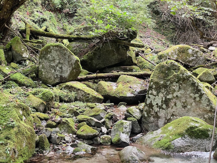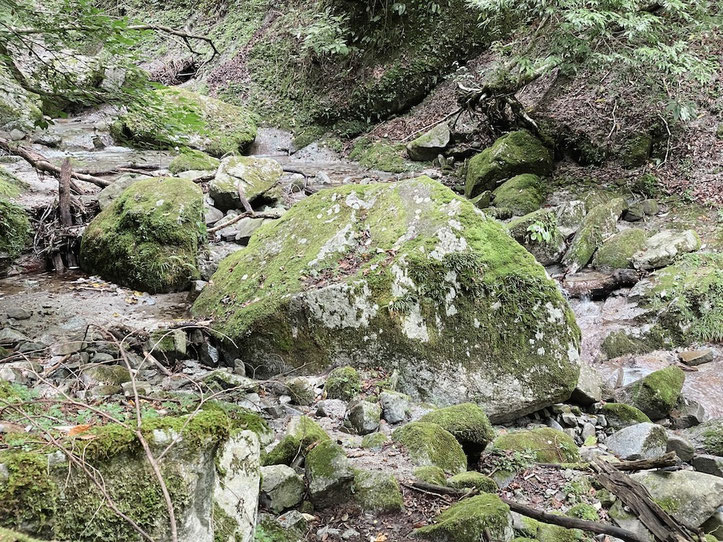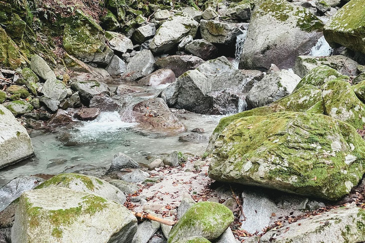 畦ヶ丸の良いところが詰まった場所だ。小さい滝と透き通る沢の水、苔むした石や岩たち。岩からは無数の植物が生えている。
