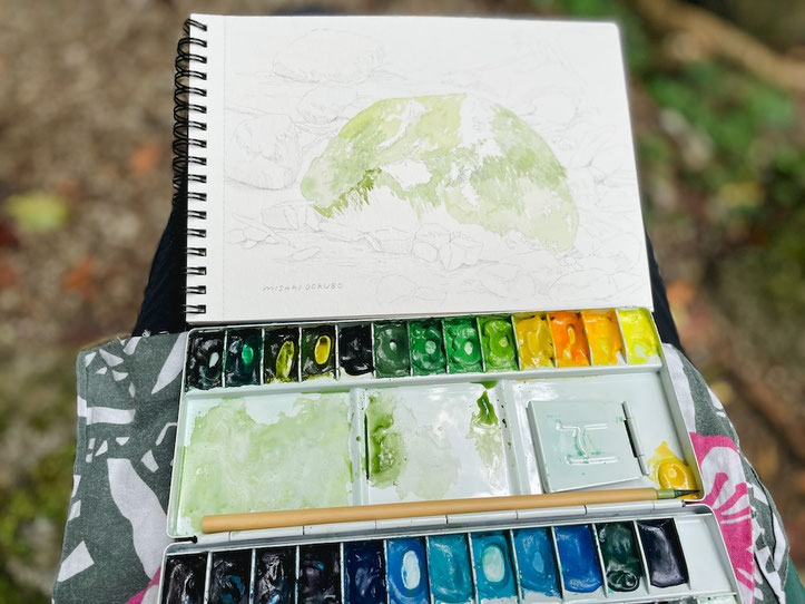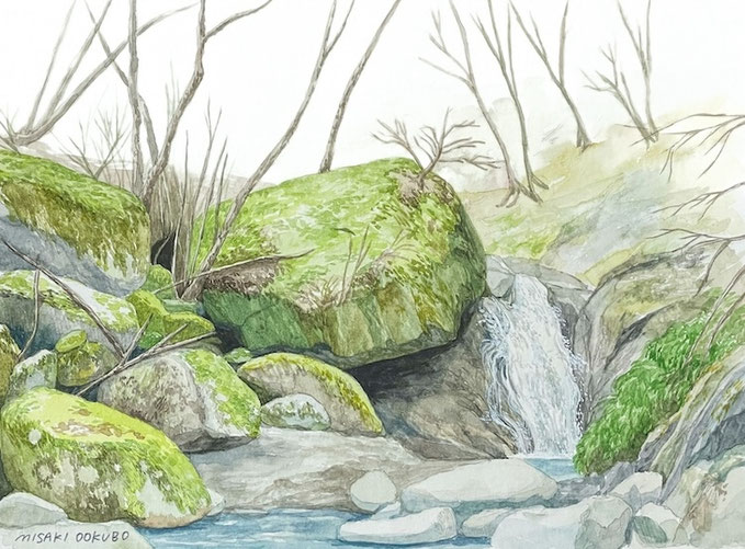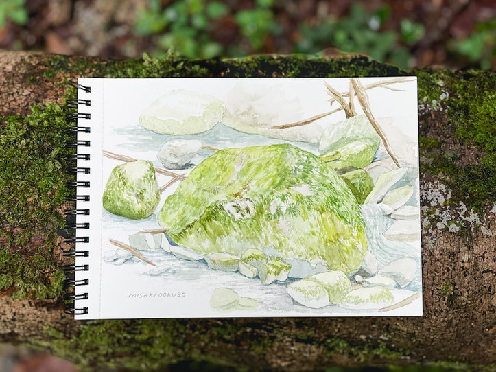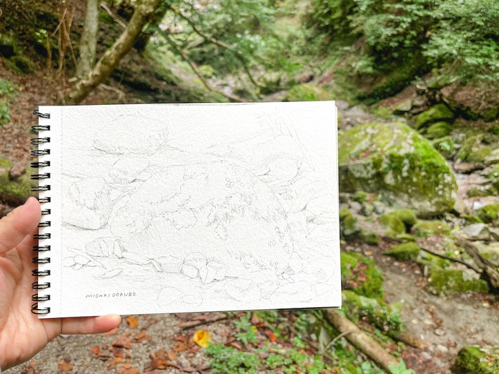 もう一つの滝、本棚の方にも行ったが、増水していて近くまで行けず…という事で、本棚近くにあった良い感じの岩を描く事にした。
